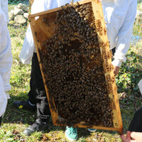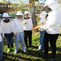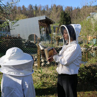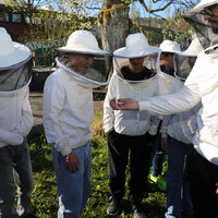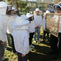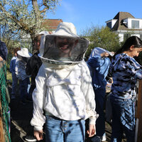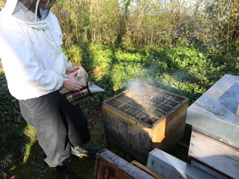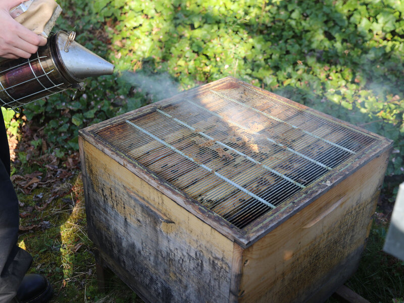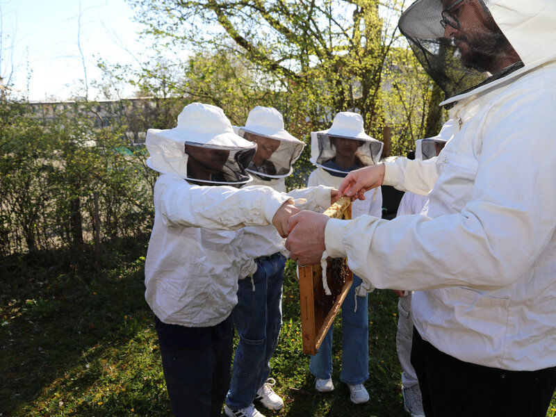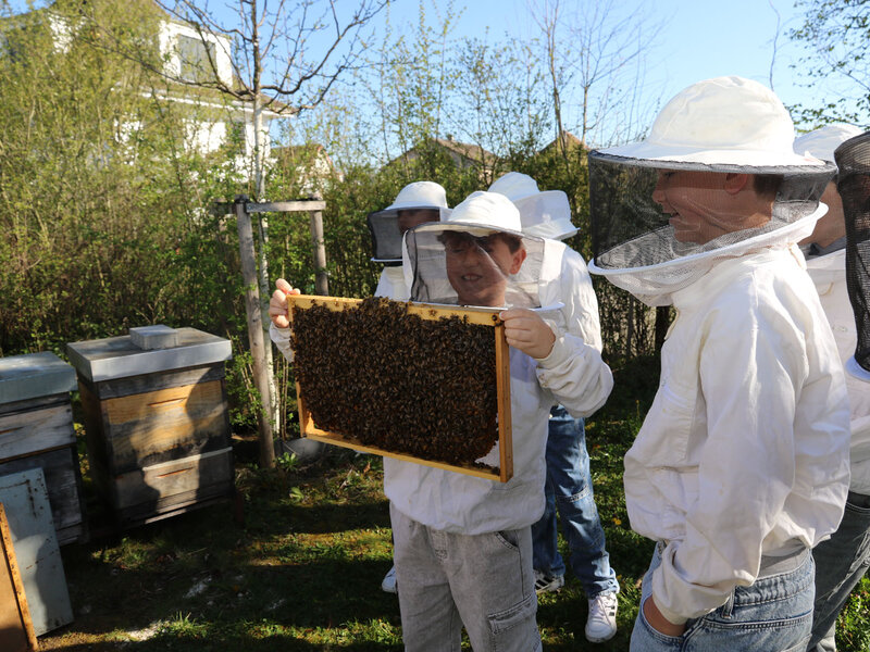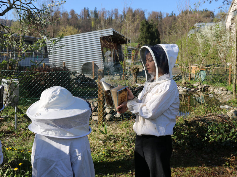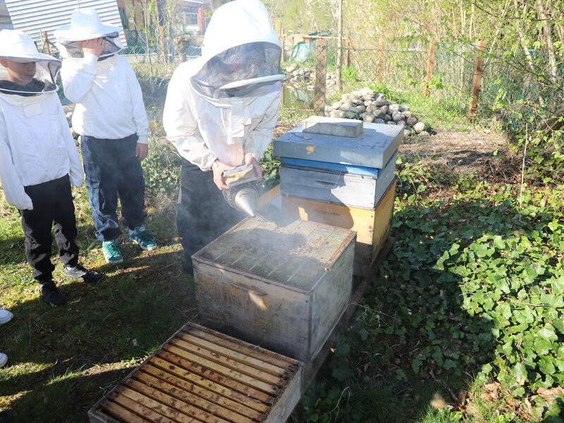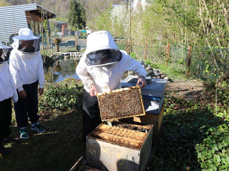 Anschliessend durfte die Klasse ein Bienenvolk aus nächster Nähe betrachten. Zum Schutz gab es für alle Imkerjacken mit einer Schutzhaube für den Kopf. Als zusätzlicher Schutz vor Stichen kam zudem Rauch aus dem Smoker zum Einsatz. Dieser beruhigt die Tiere, sodass der Bienenstock sicher geöffnet werden kann. Die Bienen interpretieren den Rauch als Zeichen eines möglichen Waldbrands und beginnen instinktiv, Honig zu fressen, um sich auf die Flucht vorzubereiten. Dieses Vollfressen macht sie ruhiger und weniger stechfreudig.