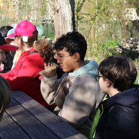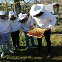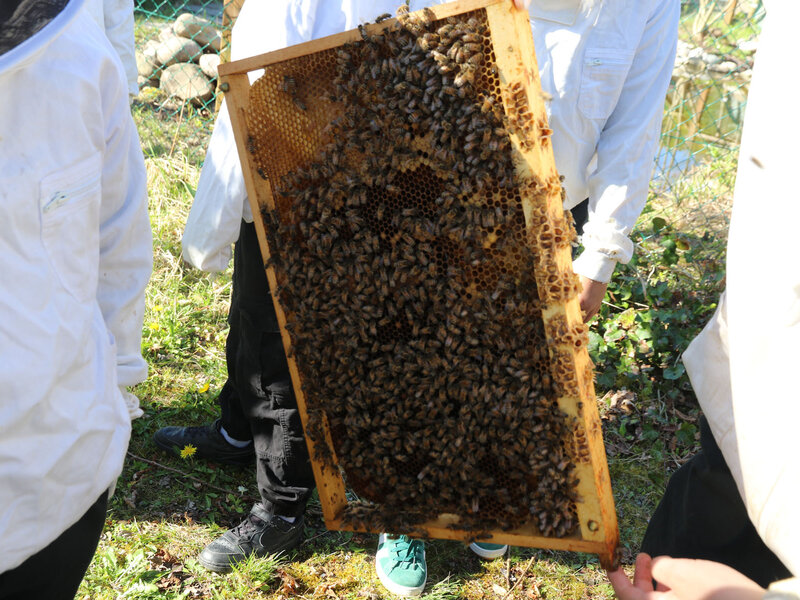 Von ganz nah durften die Schülerinnen und Schüler eine Brutwabe bestaunen. Jede Biene im Bienenstock hat ihre Rolle. Die Königin sorgt für Nachwuchs. Die Arbeiterinnen fliegen aus, sammeln Nektar, bauen Waben, füttern die Larven und halten den Stock sauber. Die Drohnen, also die männlichen Bienen, haben nur eine Aufgabe: Sie begatten die Königin.