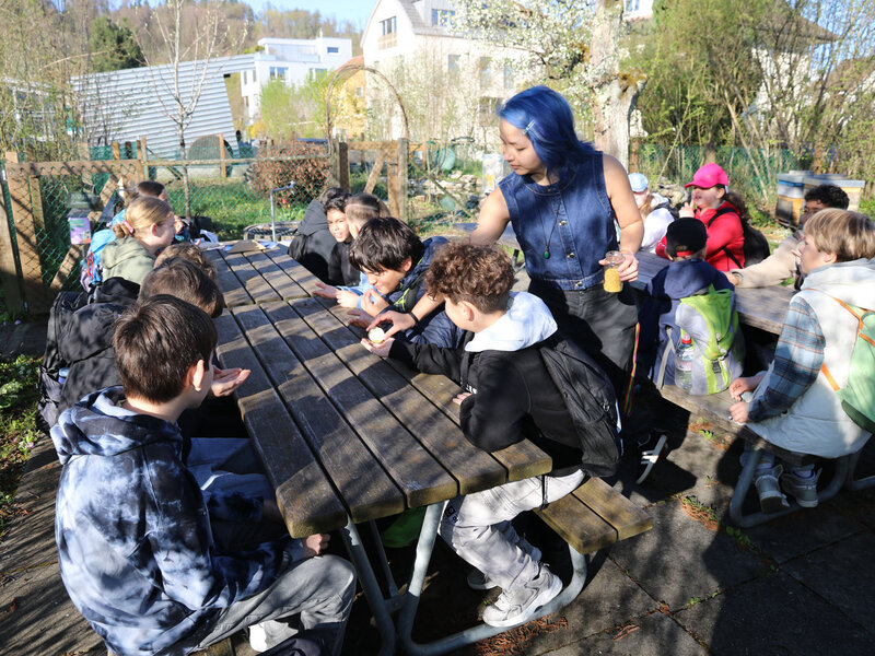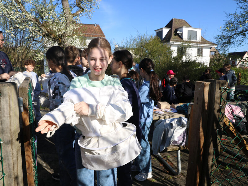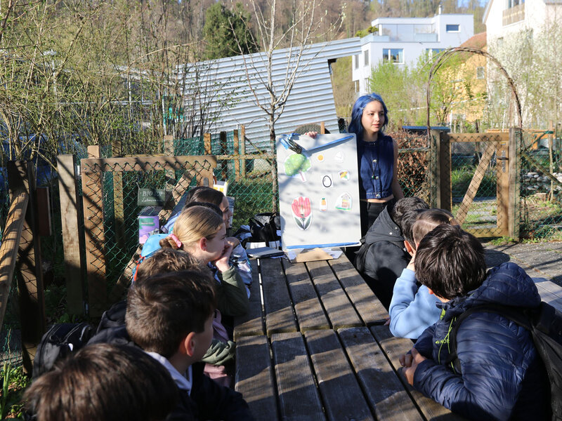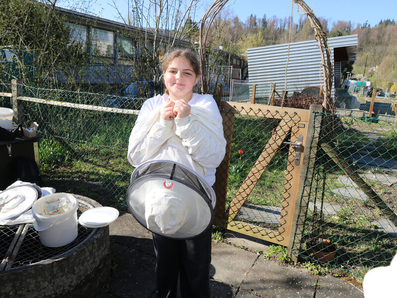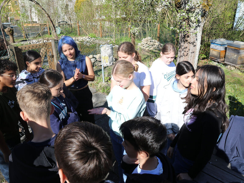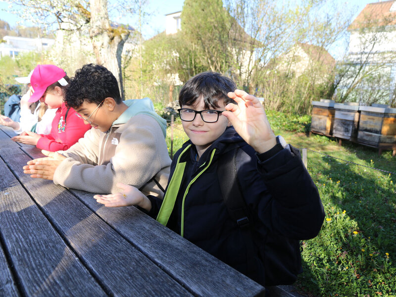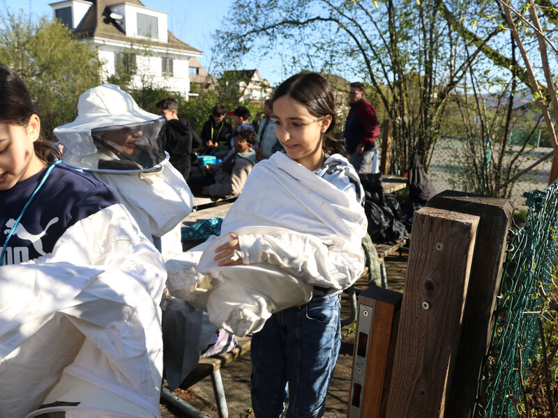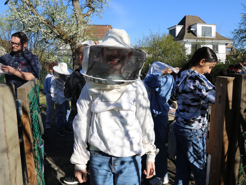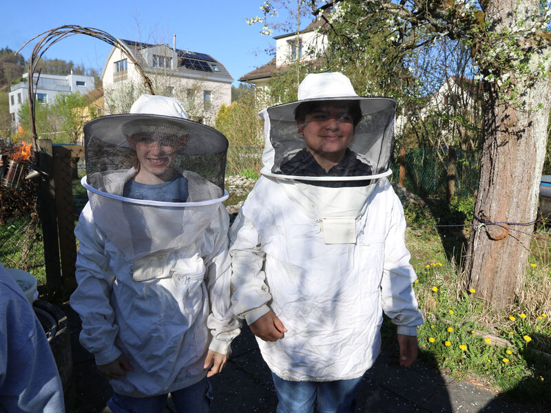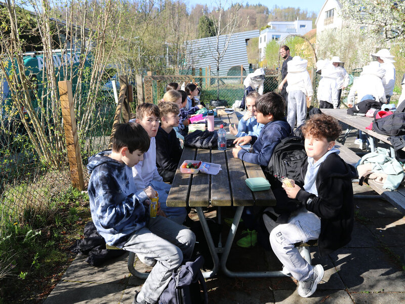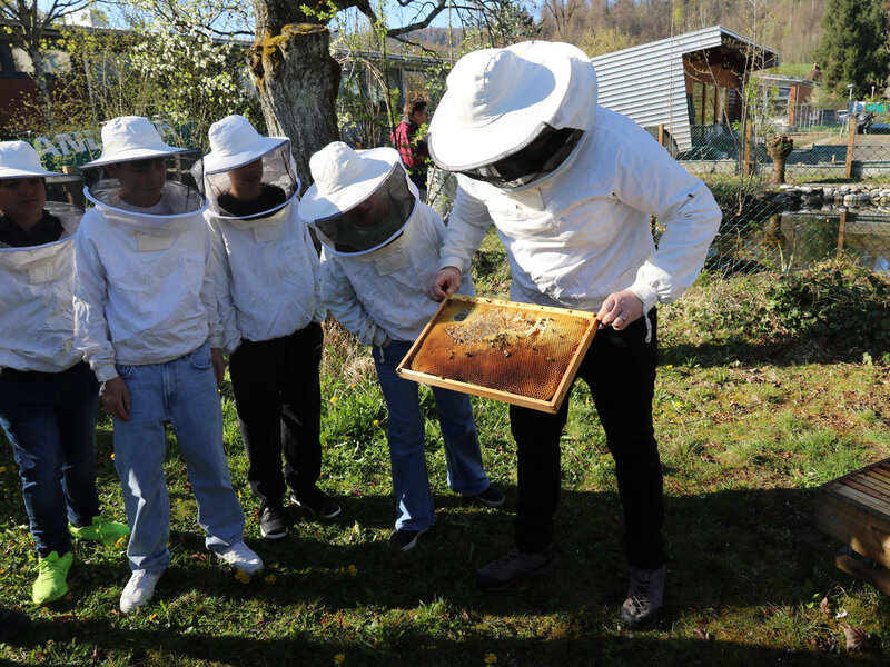 Als Abschluss des Unterrichtsthemas besuchte die Klasse am Dienstag, 7. April, die Imkerei der Wabe3 in Altstetten in Zürich. Die urbane Imkerei betreut rund 100 Bienenvölker an zwölf Standorten in der Stadt und produziert lokalen Stadthonig. Für Schulklassen bieten sie beim Bienenstand auf dem Schulareal Untermoos Führungen an.