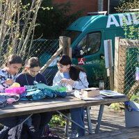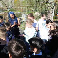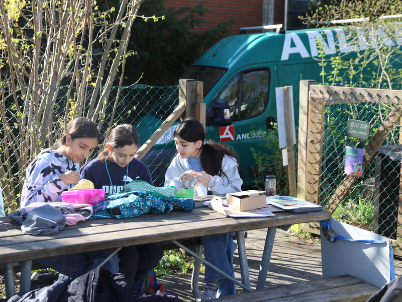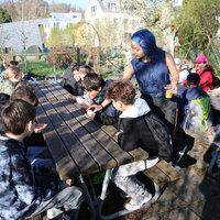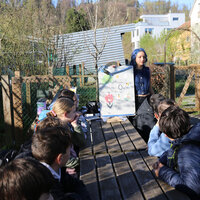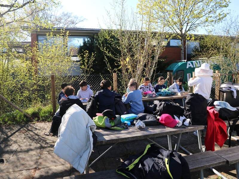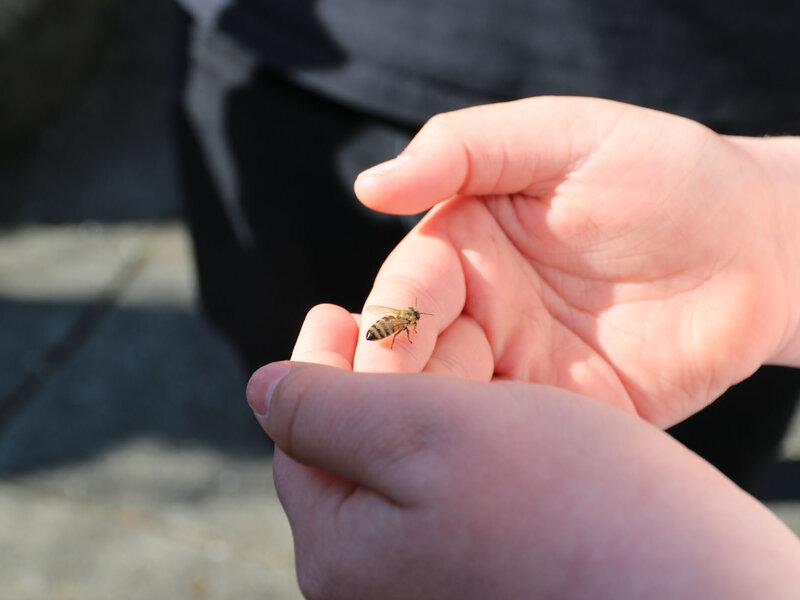 Vor der Besichtigung der Bienenstöcke frischte Katie Richard von der Wabe3 das Wissen der Kinder auf. Sie erklärte die wichtigsten Fakten zu Honig- und Wildbienen sowie zur Bedeutung von Hummeln, die etwa für die Bestäubung von Tomaten unverzichtbar sind. Honigbienen sammeln Nektar und Pollen von Blüten, um sich und ihre Brut zu ernähren. Honig wird aus Nektar gemacht. Daneben produzieren Honigbienen aber auch Wachs für den Wabenbau, Bienenharz (Propolis) zum Abdichten und zur Desinfektion des Bienenstocks und Gelée Royale als Nahrung für die Königin. Imkerinnen und Imker ernten nur den Honigüberschuss aus den oberen Honigräumen; den Vorrat im Brutraum behalten die Bienen für den Winter.