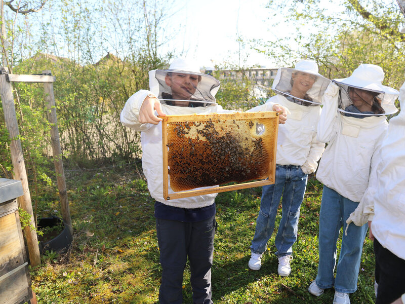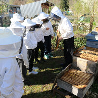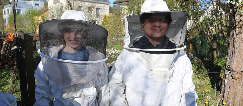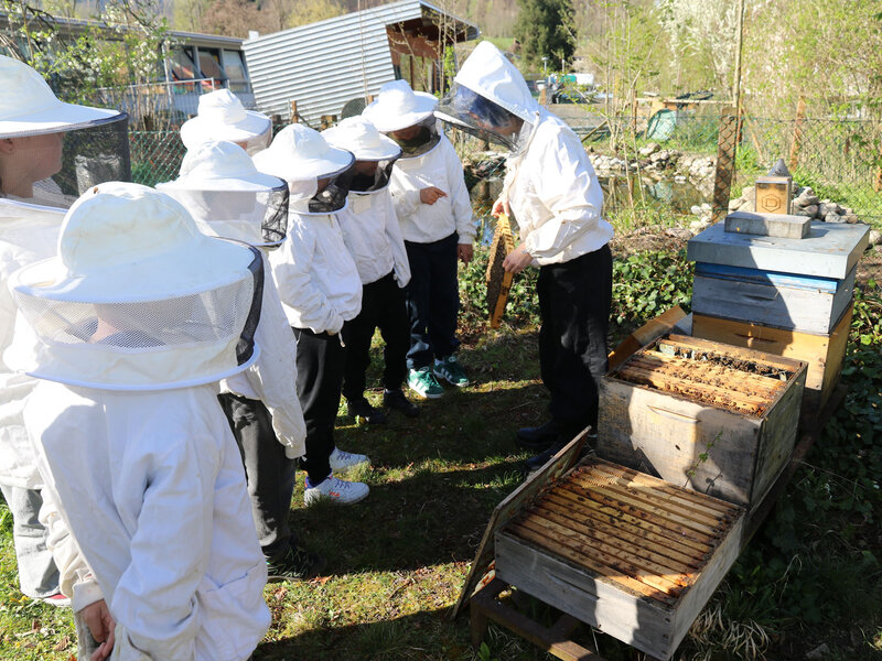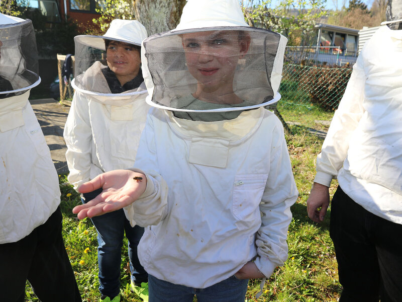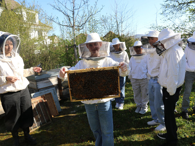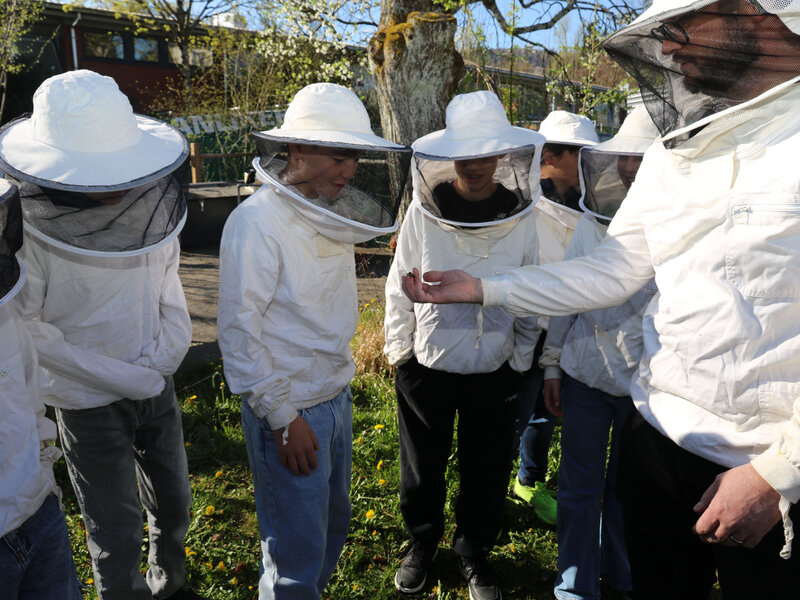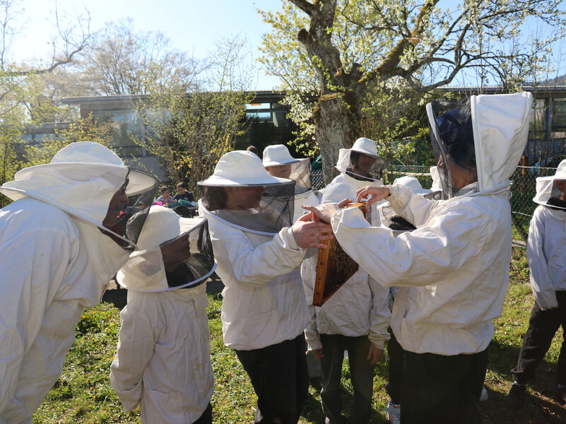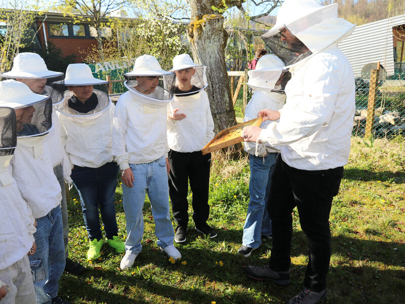 Im Fach Natur, Mensch, Gesellschaft haben sich die Schülerinnen und Schüler intensiv mit den hilfreichen Insekten beschäftigt. Besonders profitieren konnten sie vom Wissen ihres Lehrers Alfred Zweidler, der selbst Imker ist und eigene Bienenvölker am Waldrand Richtung Kindhausen betreut.